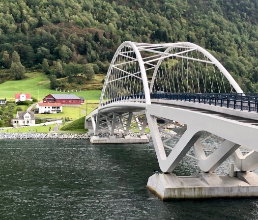 After this look into Sogndal’s past, it was time for a peek at the future. Loftesnesbrua, a steel bridge that crosses Sogndalsfjorden, was built in late 2017/early 2018 and has received awards for its construction. While we intended to cross the bridge on today’s walk, we eventually decided to save our strength (and get out of the chilly breeze), so we shelved the crossing for another time.