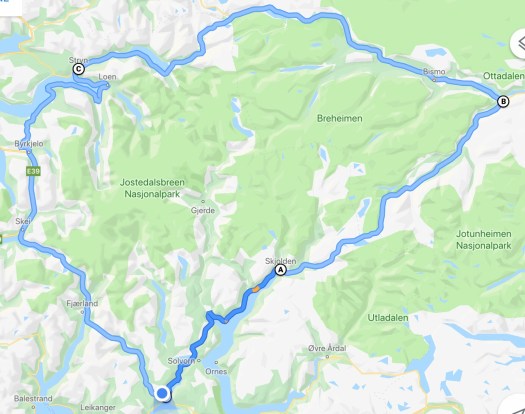 My roughshod attempt at a map illustrating our journey—first northeast to Skjolden and Lom, then back west to Stryn, and back south again to Sogndal.