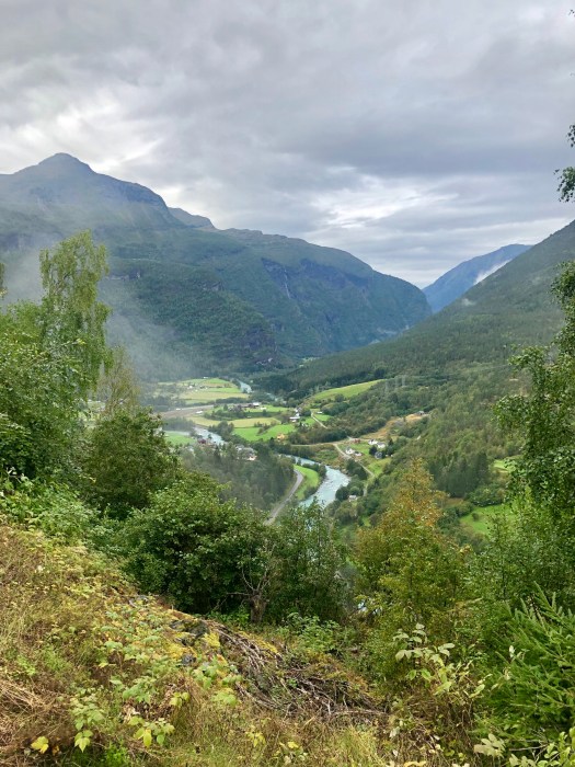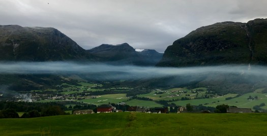 A low-hanging mist over Byrkjelo had multiple cars stopping with us to take pictures.