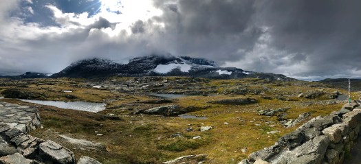 Sognefjellet is a snaking mountain pass that starts near the town of Skjolden at the end of the Sognefjord and eventually descends into the town of Lom. The road runs directly between two national parks–one is the Jostedal Glacier, mentioned yesterday; the other is Jotunheimen–so the views are, well, I’m afraid I’ve run out of words. This trip has already stretched my command of prose to its limits, and this tour today took us to a place where my composition simply cannot follow.