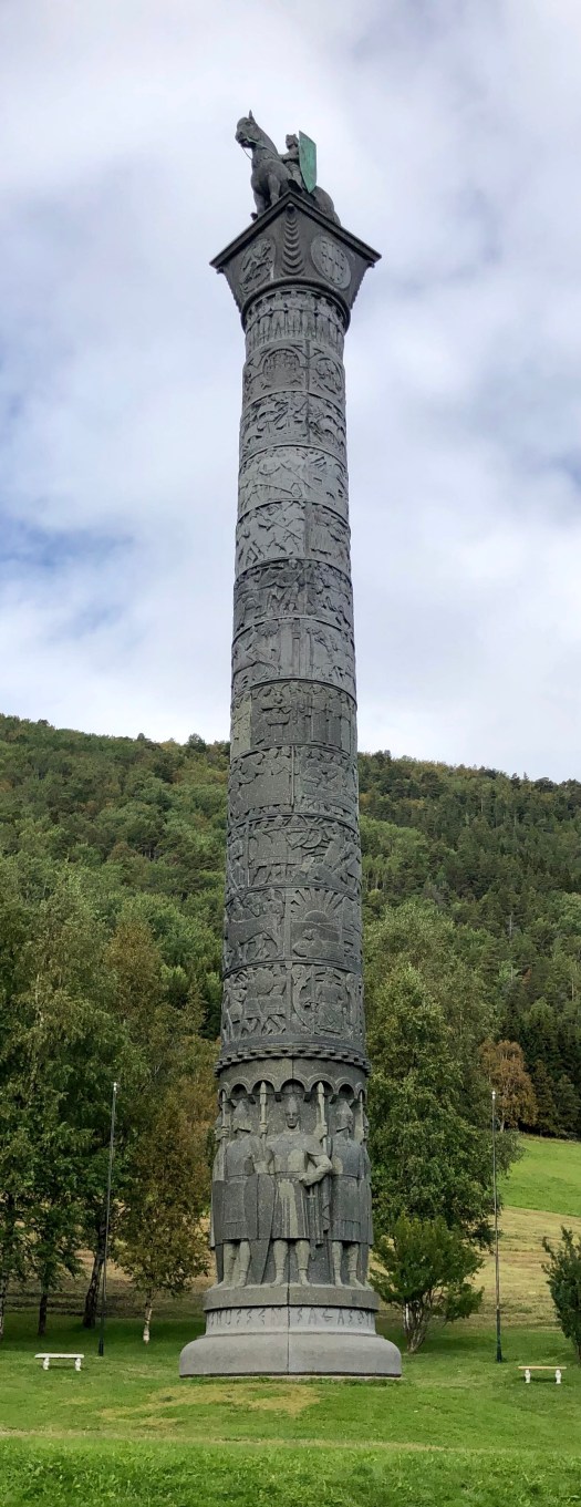The massive column dubbed Sagasoylen is stationed outside the Elveseter Hotel on the descent of Sognefjellet. The column depicts images from critical episodes of Norway’s history, and is crowned by a depiction of King Harald Harfagre, the supposed “first king of Norway”—though historians have recently cast doubt on the accuracy of the popularized version of his tale.