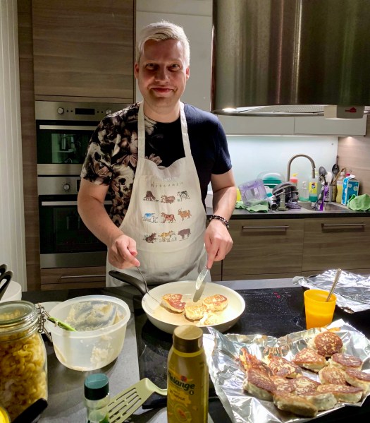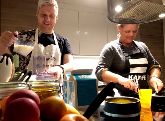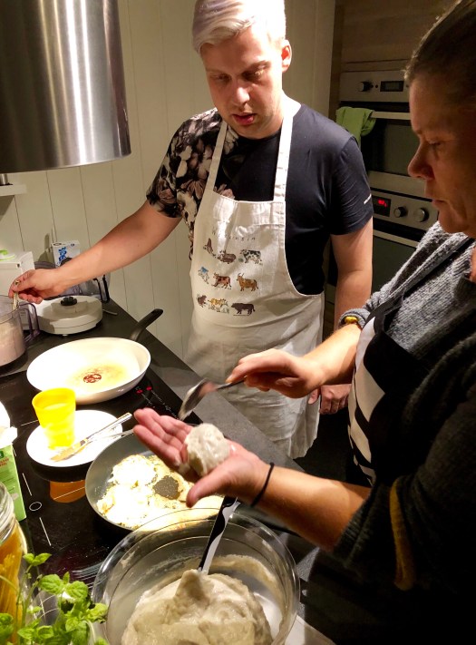 After partaking in a perfect dessert of vanilla ice cream, raspberry coulis, and sjokoladefondant (as best I can tell, we would refer to this as molten chocolate cake in the U.S.), we arrived at my favorite part of the day. I had shared with Marit early in our visit that I am a big fan of cooking, and she graciously offered to show me how to make fiskekaker–fish cakes. So, donning an apron adorned with Wisconsin cows–a gift from my parents’ previous visit that undoubtedly empowered me with renewed fortitude–I joined her in the kitchen for a lesson. The recipe of minced cod (torsk), potato flour, salt, and a seasoning blend of various spices produced a bounty of moist, attractively seared fish morsels that we will excitedly devour for our next meal in Sogndal. (I can neither confirm nor deny that my dad and I snuck sample bites during the cooking and were quick enthusiasts.) Marit, thank you for being such a great teacher and for offering to show me around your kitchen. This truly was one of my favorite activities so far in Sogndal, and I look forward to cooking with you again any time you will have me!
