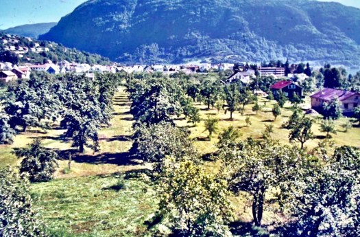 My dad took a photo from almost exactly the same spot in 1971 on his first visit to Norway. The change in the orchard’s size is obvious, and you can also see many changes to the buildings across the town. Photo courtesy of K. Foss.