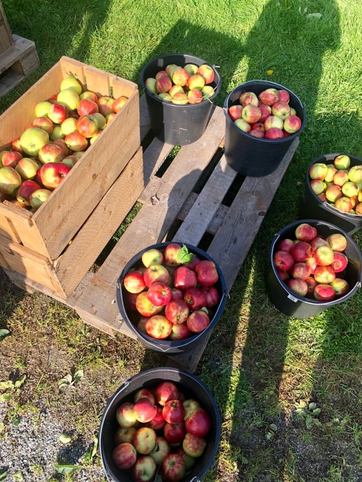 Our mission laid clear–pick the larger, redder apples, not the smaller or entirely green ones (for the apple aficionados in the audience, these were Gravenstein apples)–we set out with buckets in hand. The weight of the task felt initially intimidating: this was a business, after all, not just a lighthearted frolic through the eplehage. But a manageable learning curve and the goodnatured encouragement of the veterans quickly dissolved any early anxieties, and the process turned delightful. A rush of excitement met the discovery of each perfectly plump specimen; on many occasions, it was tempting to pause for a snack. The orchard appears modestly sized at first glance, but, many bucketfuls into the process, you begin to understand that the trees are more bountiful than they might seem. Four hours later, we had covered, optimistically, about fifteen percent of the total picking area. My admiration of Erik’s decades of laborious work was accordingly magnified.