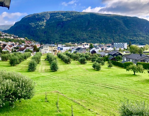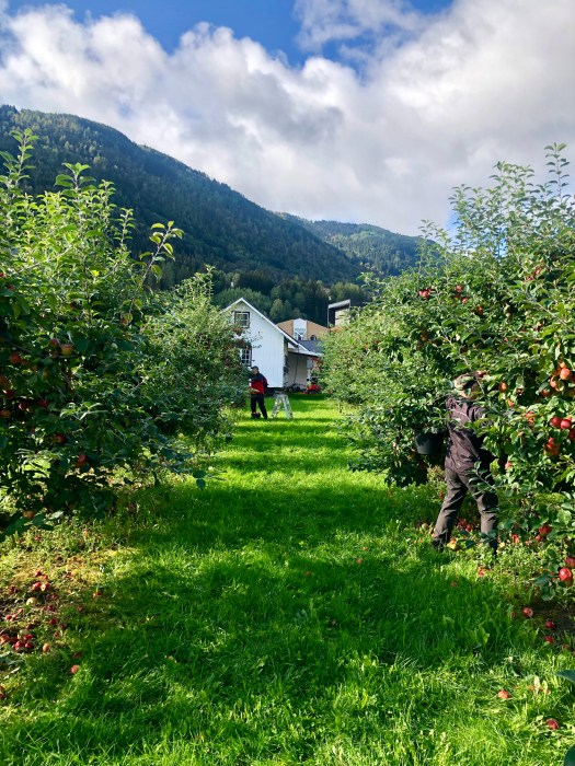 The second half of September through much of the rest of the fall is apple picking time in Sogndal. Many of the households have trees that grow the fruit in their yards; some have only a few, while some possess veritable orchards. On the old, main Foss homestead, it is very much the latter, though my dad and other relatives have shared that the size of the orchard has dwindled considerably over recent decades. Apples have been–and are still–a source of income for the family, the fruits of their labor (ha) shipping to many vendors across Norway.