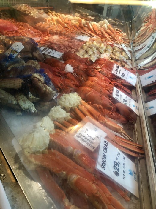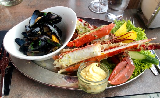 After successfully stowing our luggage in our respective hotel rooms, the parentals and I headed back to the fish market, this time with the intention of actually sampling some of the offerings. I have explained to several relatives that I have a mild-to-moderate (but also unpredictable) allergy to shellfish, but I have historically ignored the resulting discomfort in the case of crab and lobster because I enjoy them too much. Today, I proved it–and I’m happy to report that the histamines remained dormant. My platter of mussels, king crab and Norwegian lobster steamed with garlic was a beautifully fresh way to dedicate our arrival in Bergen.