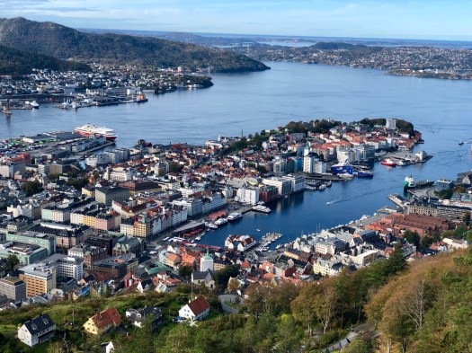 On account of our expedient arrival, we were faced with the need to kill some time around town before checking into our hotel. We therefore joined the throng of tourists waiting to board Fløibanen, a cable car that runs up to Mount Fløyen, where visitors can behold a large swath of the city in a single view. This first endeavor made our change in scenery crystal clear, and immediately so, as we joined hundreds of other onlookers in this activity, all snapping selfies and swarming the gift shops in droves.