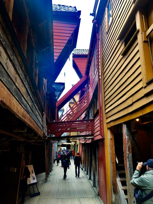 Bergen still maintains many of the charms of a seaside mercantile city, even if many of the vendor stalls have now given way to souvenir shops and the bustle comes in the form of tourists rather than visiting merchants and buyers. An example is found tucked away behind the famous quay houses, where a narrow cobblestone street is criss-crossed by wooden walkways and display beams and houses a charming variety of craft shops and artists’ galleries. And while I know there is very little left in the world that is both deeply historical and also untouched for the purpose of tourism, our trek through this area of town was probably the closest I’ve felt so far to experiencing an unblemished version of Bergen’s history.