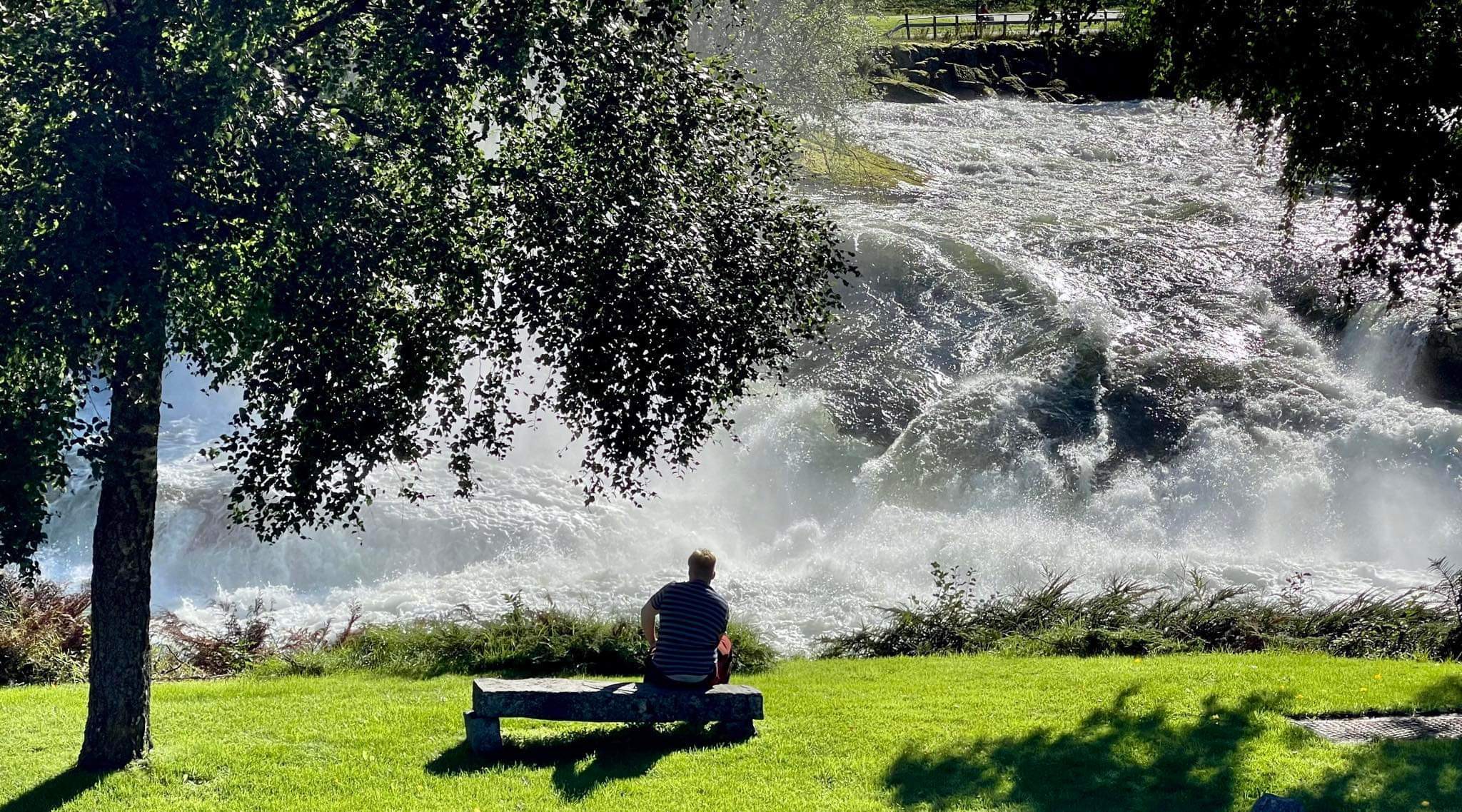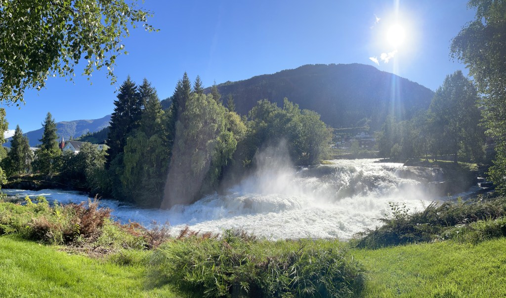 Next stop: the foss. For those unfamiliar, my surname is the Norwegian word for “waterfall,” and the reason can be found right here in the center of Sogndal. The fall–our fall–runs right next to the plot of land that hosts the Foss ancestral home, which was recently rebuilt and renovated to a more modern look by current stewards Bente and Arild. Norwegian surnames are often taken from geographic features nearby (Foss for waterfall, Berg for mountain, and Dahl or Dal for valley, to name a few). I can’t overstate how powerful it feels to look upon a force of nature and recognize that it inspired something as personal as your name.