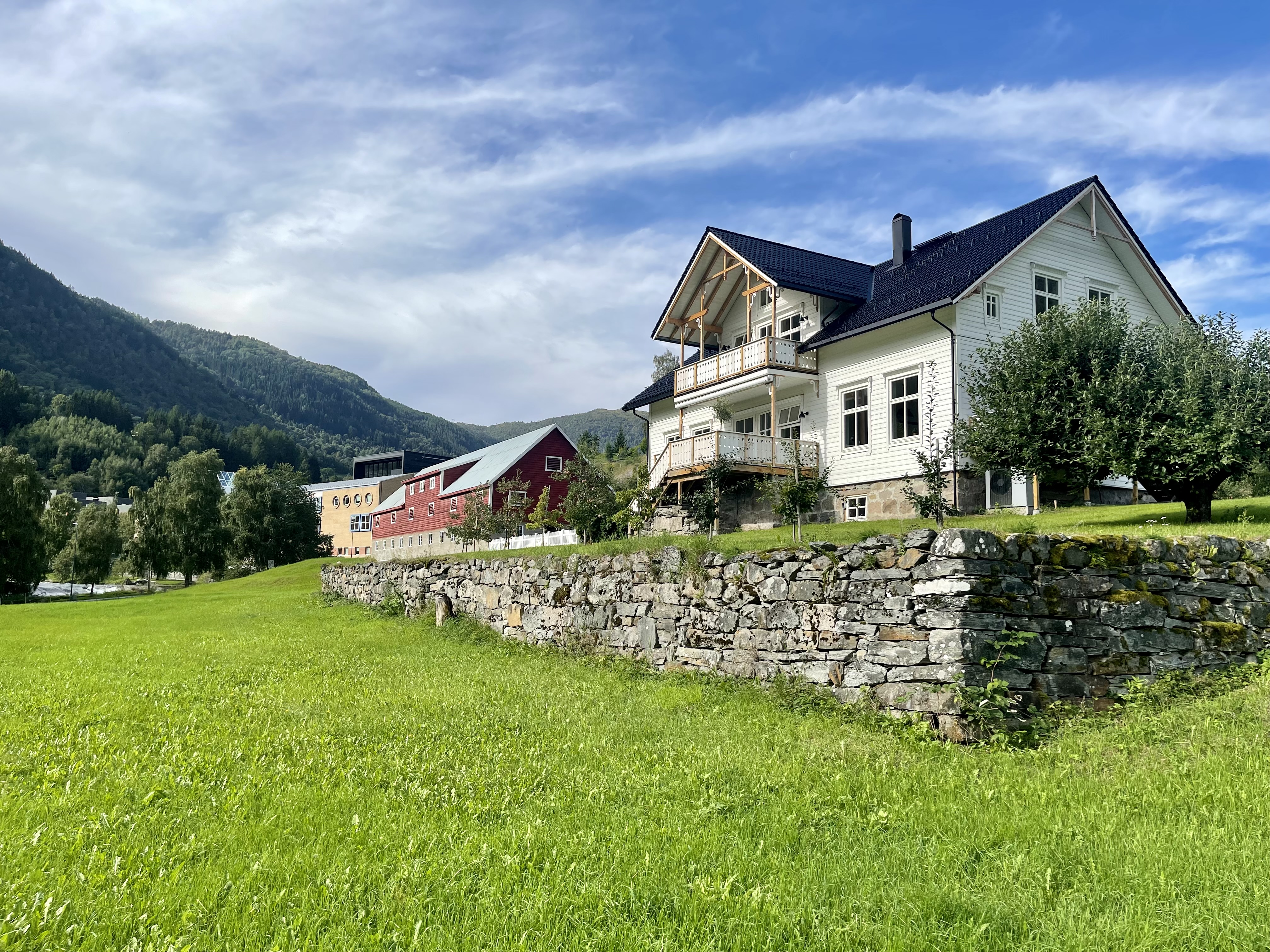 Our marquis appointment for the day was an audience with Erik Foss. Erik’s parents, Karl and Brita, had six sons, five of whom still live in the Sogndal area; the sixth, Bjarne, who visited my family in Madison, Wisconsin in the 1990s, sadly passed away many years ago. Of the six, Erik is the eldest, and as a result it is his daughter, Bente, and her husband, Arild, who now are the caretakers of the ancestral Foss house. Erik’s house sits on a plot just down a small hill from the house, so his property gave us the first good vantage point to check out the result of recent demolition followed by renovation that the ancestral home has undergone. There has been an obvious commitment to honoring the original look of the house, as the untrained eye could be forgiven for thinking there had been no demolition or reconstruction at all.