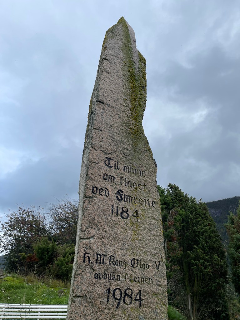 On the way there, though, we stopped to inspect the minnestein–memorial stone–that was erected in 1984 in a ceremony with King Olav V to honor the previously mentioned Battle of Fimreite. (We visited the site of the battle several days ago, but at that time we were on the opposite side of the fjord from where the stone stands.) My dad and I have wondered why the battle seems to receive so little local fanfare despite having been so historically significant, and our trek to the obelisk only deepened those questions: our crawl through knee-high poison ivy to reach the minnestein was clearly not a path well trodden. On the bright side, we left the scene confident that we had ventured well off the traditional tourist map.