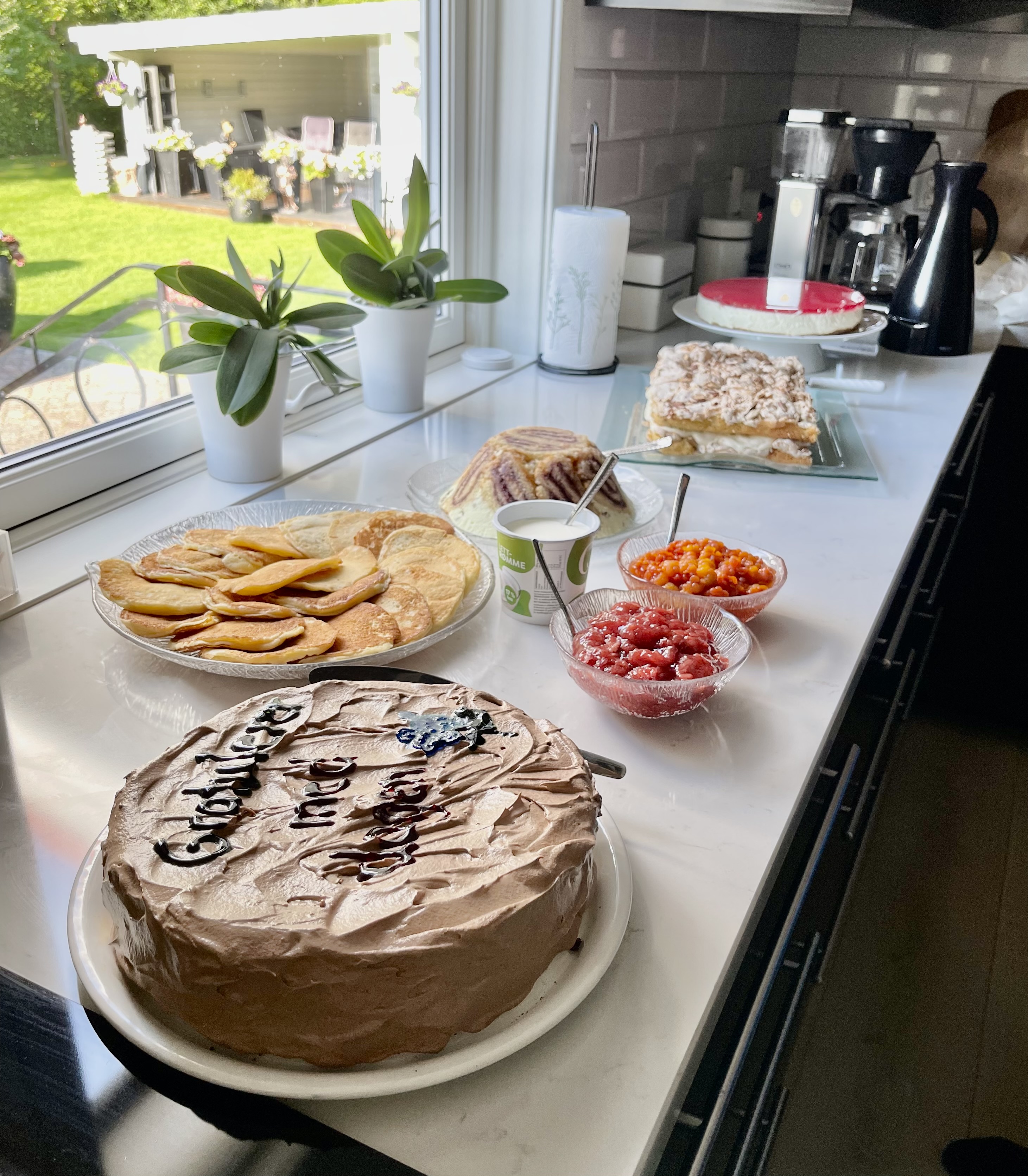 Back in Sogndal, we had an important day to commemorate. Arnor Foss, of Sognefjellet navigation fame, turns 83 today, and it was our privilege to help roll out the red carpet for him and wish him a heartfelt gratulerer med dagen! True to form, his wife Kari, daughter Mona, and daughter-in-law Marit filled the kitchen with a delicious dinner followed by the crowning glory: a spread of no fewer than four different, technically demanding cakes; local jams (including one not impossible but difficult to find in the U.S., cloudberry); and, of course, limitless coffee. On my last visit, I was unable to partake in Mona’s kvæfjordkake–also called verdens beste kake, “world’s best cake”–since I’d not yet had the medical visit that would eventually disprove my suspected nut allergy. This time, I happily indulged. (Dear reader: I now understand the cake’s name.)