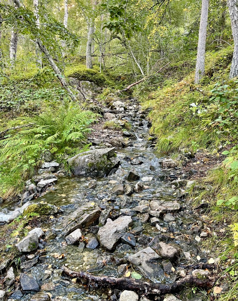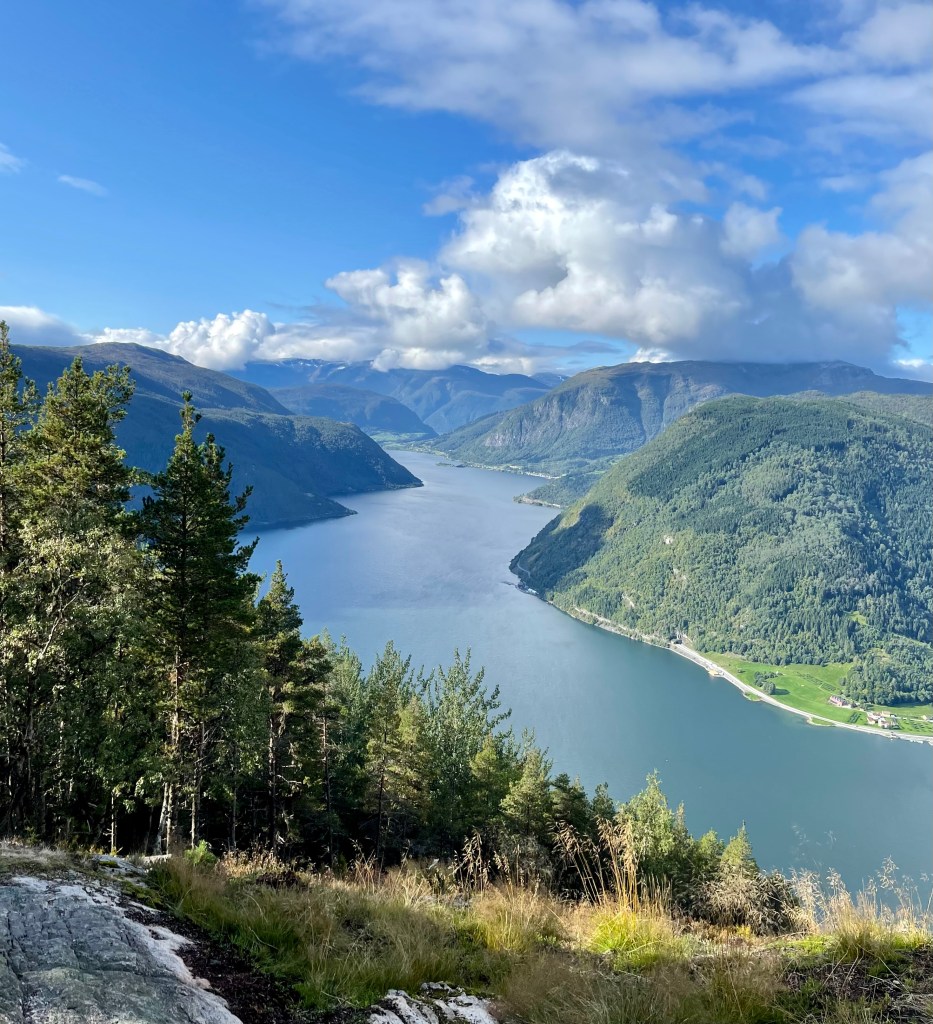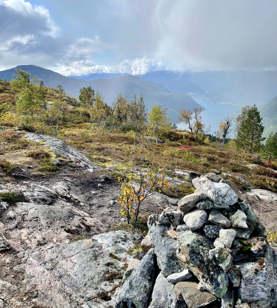 Four years ago, as many of you reading have now heard, I wove a tale of tragedy through the mountains of Sogndal. I had accepted an invitation from Geir to take a walking journey up the steep slopes, fully unaware of the physical gauntlet it would entail. About half of our intended distance into the mountain, nearly gasping for breath, I had to ask Geir to turn back, and never got to see the full, majestic view waiting at the end of our tour. To make matters worse, my shaky legs then gave out while crossing the stones over a river (okay, it was a tiny creek) and I plunged waist-deep into the water before being plucked out by Geir’s rescuing hand. The failure has haunted me ever since.