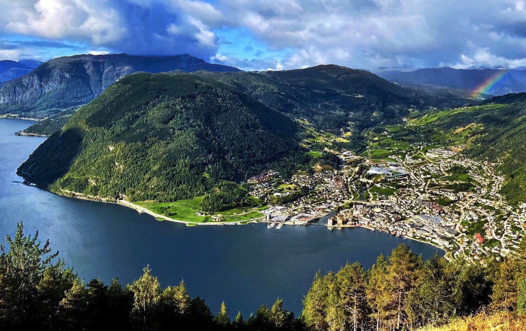 I couldn’t have asked for a better checkpoint reward than the one I received at the first lookout over the city, about halfway up the trail. As I emerged from the wooded area to behold Sogndal from height, a majestic rainbow opened over the city. I took a long moment to soak in the vista I had so rightly earned. (It merits noting that, at this point, I very mistakenly thought that I was near the end of the trail. Not so.)