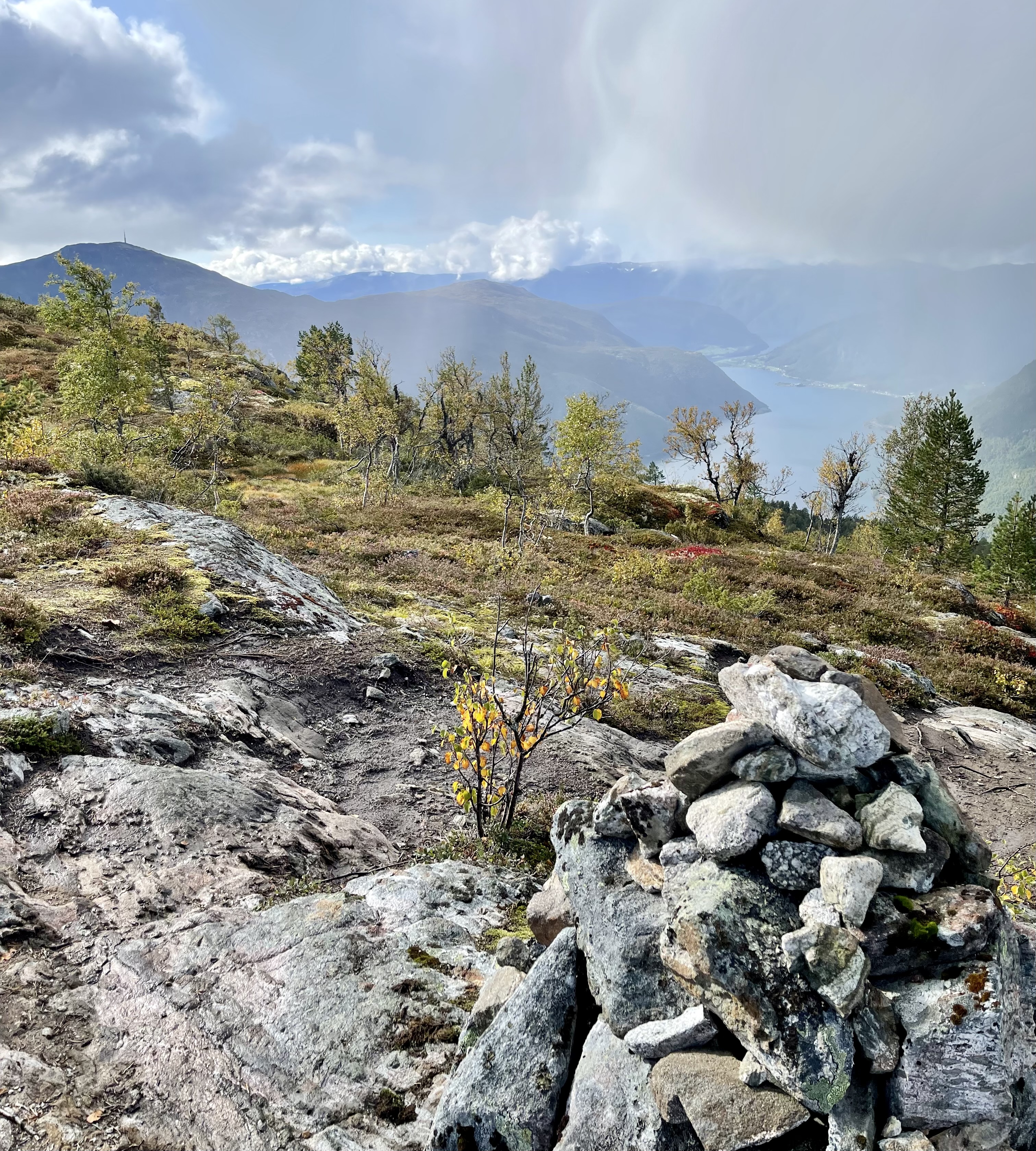 I couldn’t have asked for a better checkpoint reward than the one I received at the first lookout over the city, about halfway up the trail. As I emerged from the wooded area to behold Sogndal from height, a majestic rainbow opened over the city. I took a long moment to soak in the vista I had so rightly earned. (It merits noting that, at this point, I very mistakenly thought that I was near the end of the trail. Not so.)