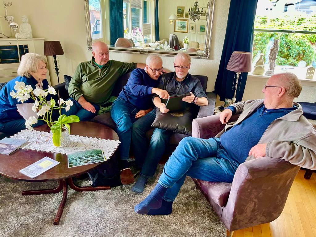 I met a good handful of the Foss clan on my first trip here in 2019, but our first home visit today, at the home of Oddvar Foss and wife Ragnhild, filled a gap I hadn’t previously covered. Oddvar is another of the six elder Foss brothers about whom much has been written throughout this blog, and the last remaining on my proverbial bingo card. (I even met the youngest of the six, Bjarne–who passed away in 2015–many years ago when he visited my family in the early 1990s in Madison, Wisconsin.) We were rejoined by Torvald Fosse and Magnar Foss, both returning faces from yesterday’s affairs. Oddvar and Ragnhild treated us to a delicious lunch of open-faced hamburgers (karbonader seems to be the closest match I can find, but I’m not sure if that’s quite accurate), vaffler, and bløtkake. The traditional round of show-and-tell with old photographs and memories followed.