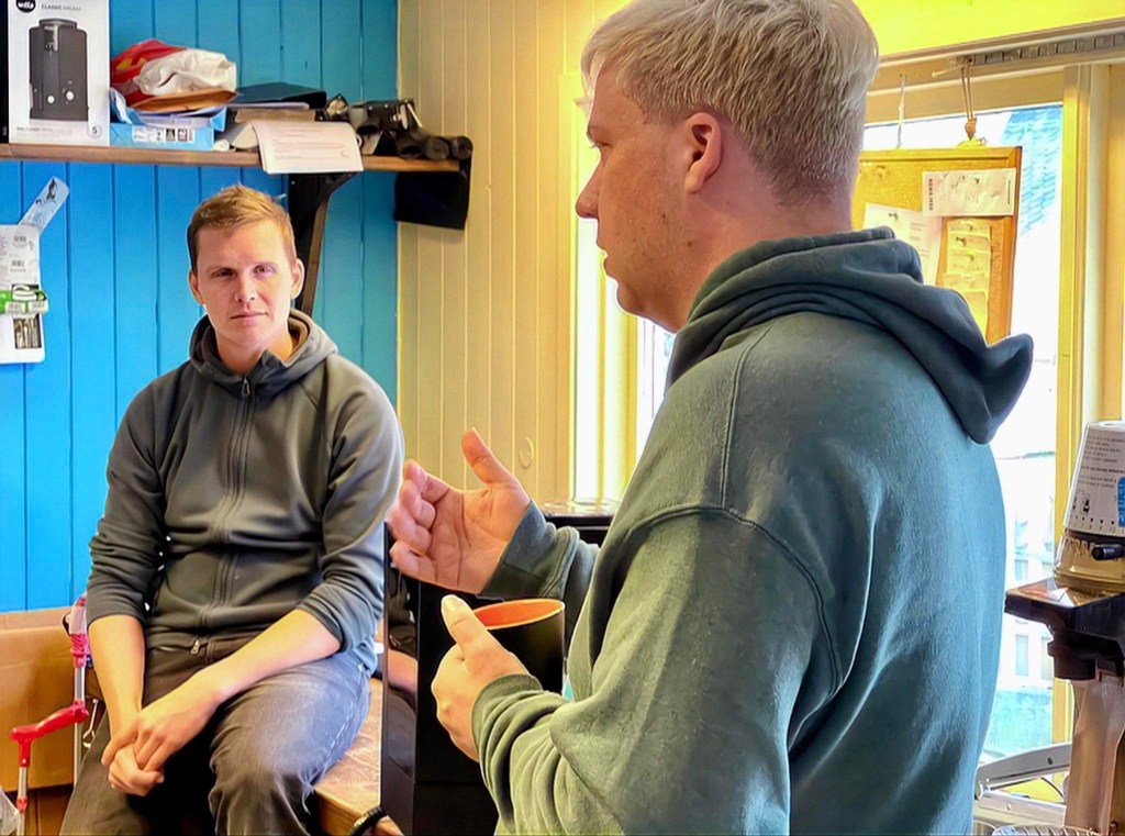 Kjetil listens as I describe our operations at Lionheart Coffee Company.