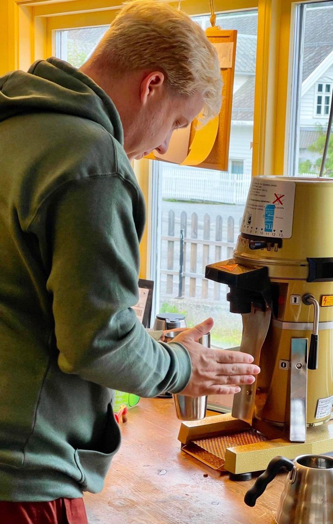 For much of this pilgrimage to Sogndal, I have played the role of listener while my dad expounds upon the various histories of past and present family members. But today was my turn to play expert. Sognefjord Kaffibrenneri started its operations in Sogndal in 2017, roasting coffee out of a small, unassuming house on Fjørevegen with a spectacular view of the Sognefjord. Today, I was able to arrange a visit with Kjetil Russenes, the owner and head roaster of the operation, who graciously took time out of his day to share a cup of brew with me and give me a little background on his time in the coffee industry.
