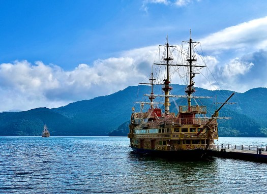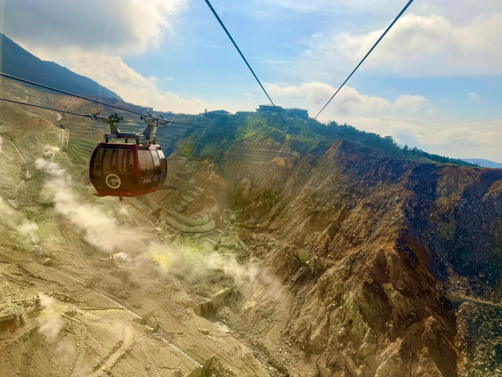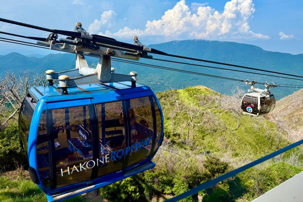 While noshing on wagyu beef curry and mitarashi dango (grilled mochi with sweet soy glaze), I couldn’t help but note an eerie similarity between Hakone and Sogndal, a city about which much ado has been written on this blog. A small river babbles through the middle of the train station area, a small set of waterfalls at its inception point (to compare them to Fossfossen, however, would be an unfair jest). Encircling the city, lush green mountainsides tower over the horizon in every direction. And Lake Ashi might almost be more accurately described as Ashi Fjord, where if you swapped out the pirate ships for silent electric ferries, you could have easily convinced me that I had fallen unconscious and woken up in Norway. Adding the gondola-style “ropeway” identical to the one we rode in Vik in 2023, the déjà vu was palpable.
