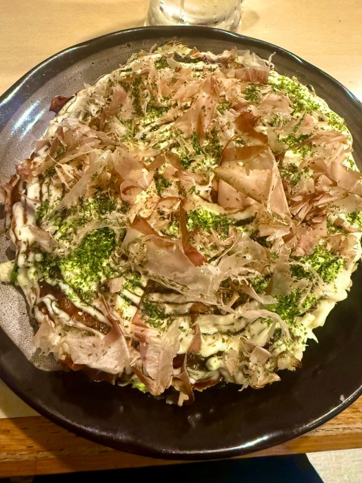 I hadn’t previously chronicled in this blog that we ate dinner at an okonomiyaki restaurant in Tokyo close to our Airbnb in Shinjuku. Part of my reasons for the snub was that it was an unremarkable and even regrettable meal—the only one we’ve had so far. And I’d been the culprit who chose it. My selection of Pizza Studio Takami yesterday had done wonders towards mending that misstep, but today’s dinner choice at Kaji redeemed the gaffe for good. Kaji is a tiny okonomiyaki-focused restaurant with about five tables run by a husband and wife pair a short block from our lodgings in Hakone. Reviews were a mixed bag—some gushed about the food and the experience while others lambasted the long wait times and the apparent stoicism of the owners. But the naysayers miss the point. This was a meal where as long as you were willing and able to operate within the boundaries and guidelines that your hosts laid out for you, it was a home run. Okonomiyaki is one of my favorite dishes in the world and I am so glad I (eventually) got to experience a memorable execution in its home country.