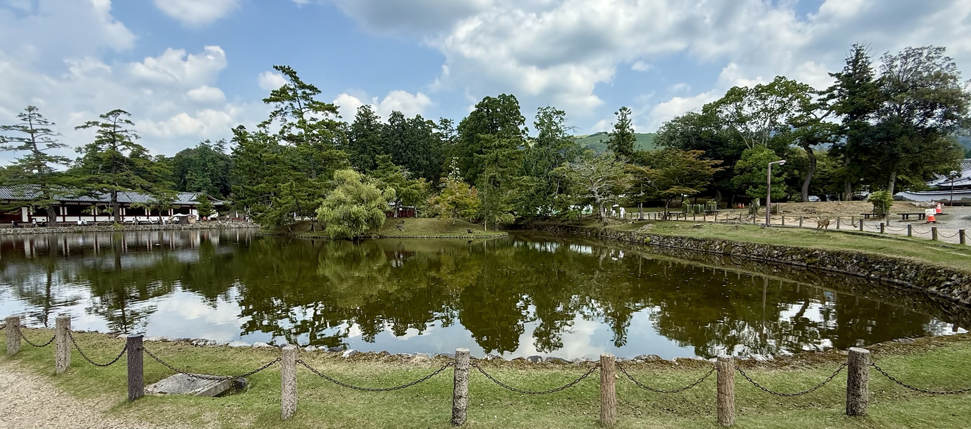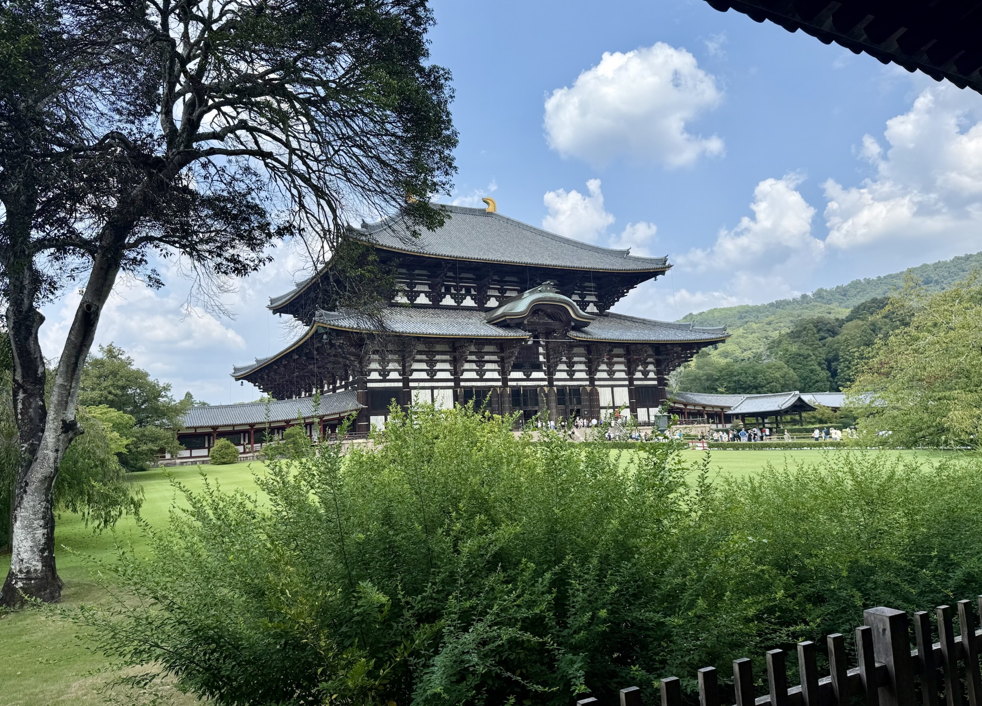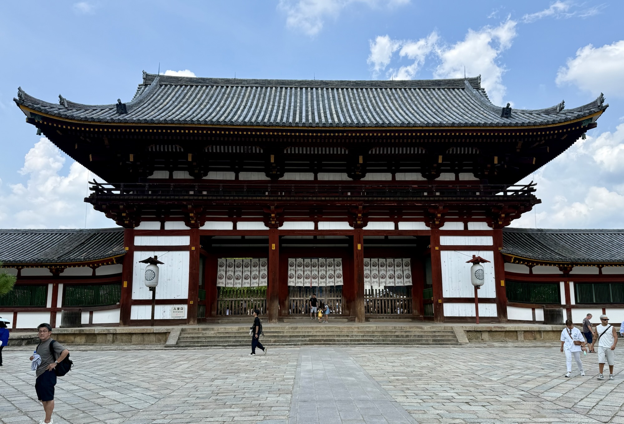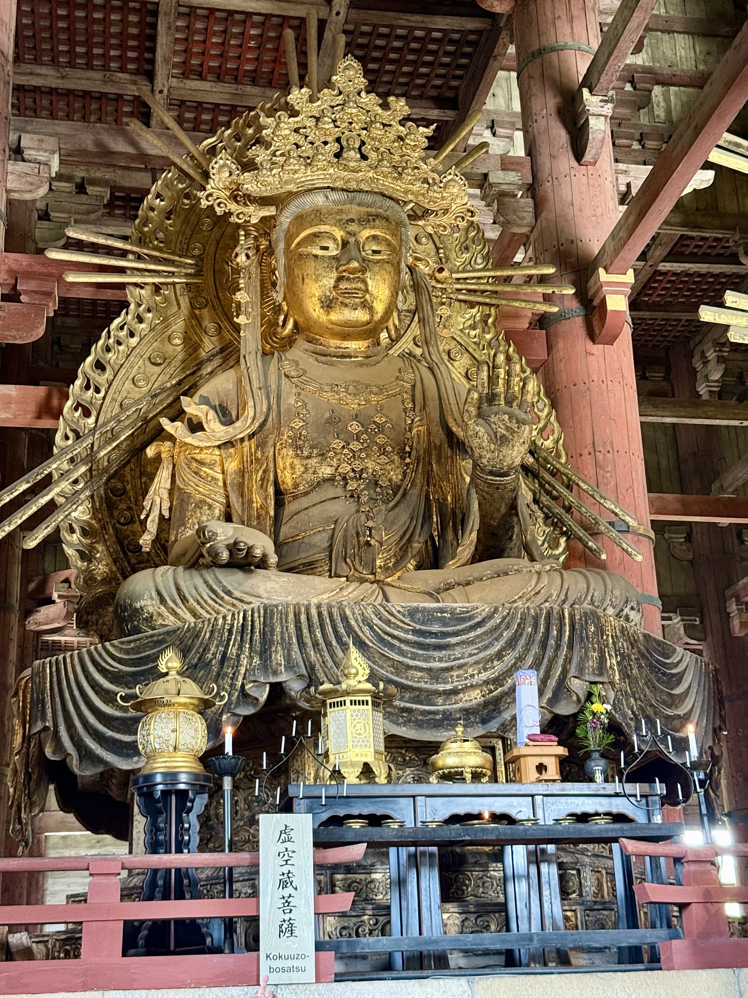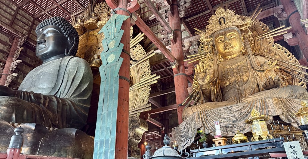 Deeper into the park, Tōdai-ji, Nara’s most prominent temple and a UNESCO World Heritage site, houses a great statue of the Buddha that towers above the foyer at a height of 50 feet. Strikingly, one bit of information we learned from an exhibit in the nearby museum—and my brief internet research verifies this—is that over 2.6 million people were involved, directly or indirectly, with the construction of the temple and the statue inside, accounting for nearly the entire population of Japan at that time. Contributions came in the form of materials, crops, physical labor, food production, masonry, and the list goes on. It was difficult not to reflect on the weight of history inside that hall, even if the temple itself has undergone multiple reconstructions due to fire and wartime damage over the centuries.