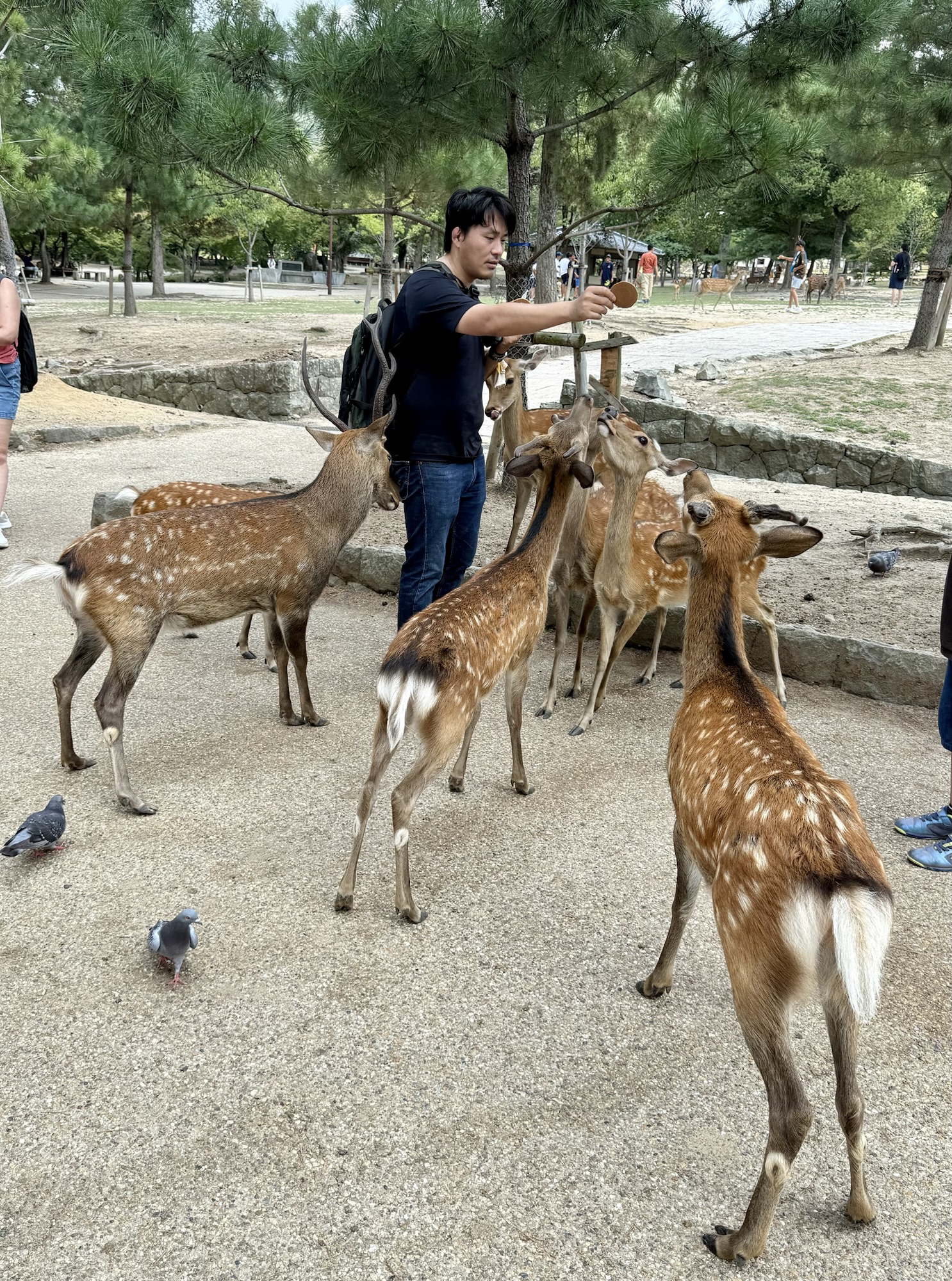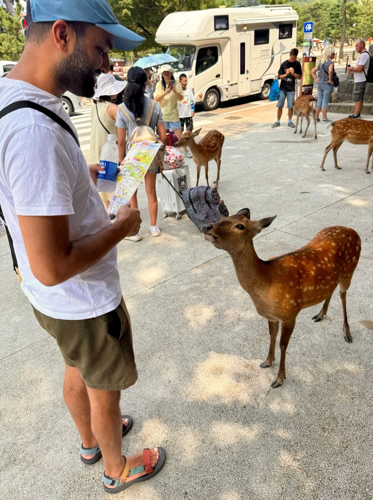 Our last full day in Osaka started with a short jaunt to nearby Nara, formerly the capital city of Japan during the eighth century and contemporarily most famous for both its giant statue of the Buddha located at one of its many temples and also its central park where scores of deer roam alongside visiting tourists. Visitors can fork over a small amount of yen to acquire a stack of crackers for feeding the eager ungulates, but the purchase comes with the unintended side effects of their riled appetites. The resident deer may be famous for their cute looks, but certainly not for their patience or manners, the lack of which manifests in pushy behavior and nibbled backpacks and fingers. We elected to forego the feeding frenzy and admire the spectacle from a comfortable distance.