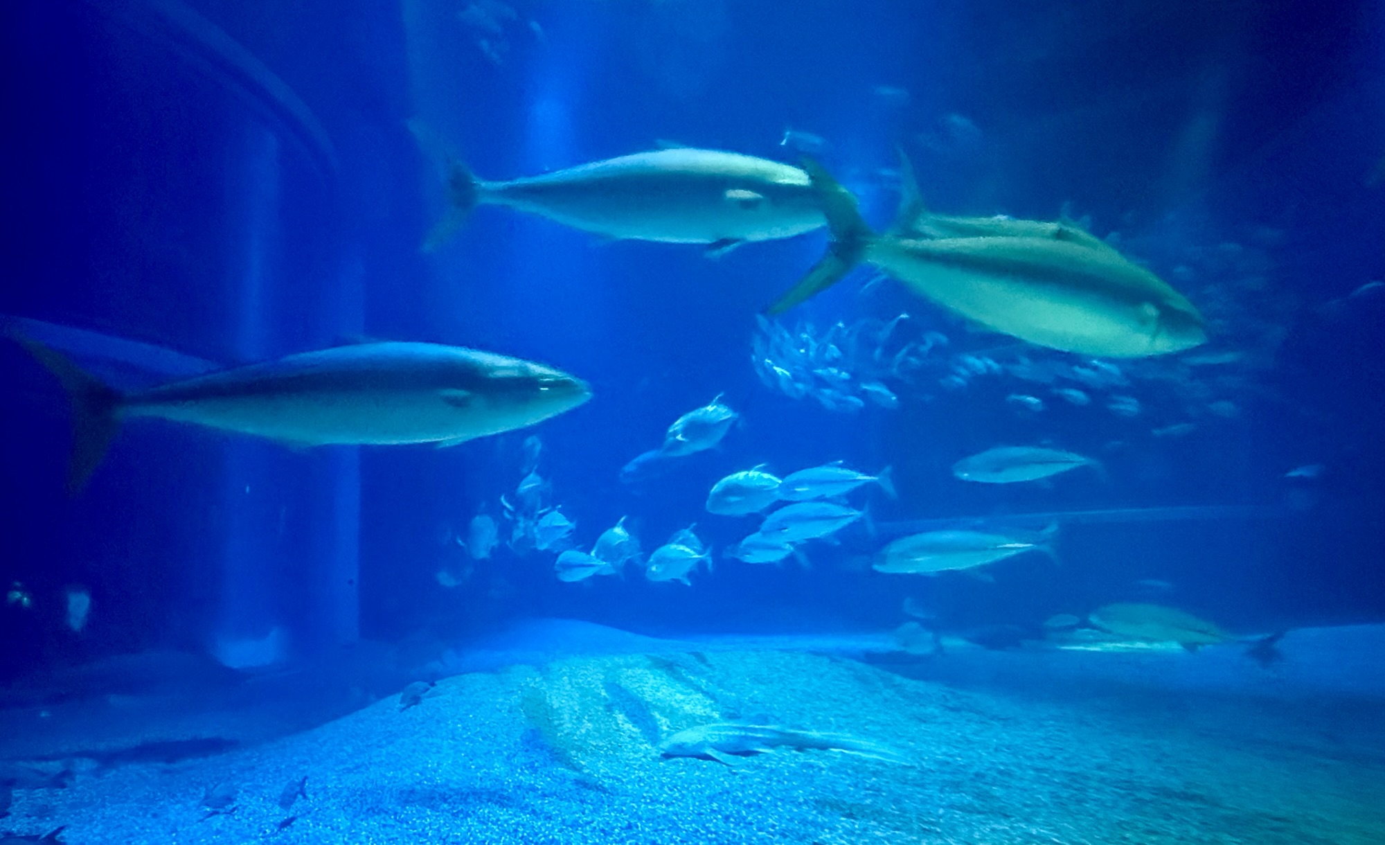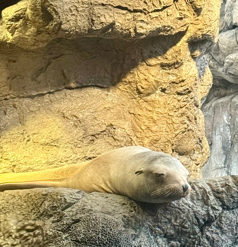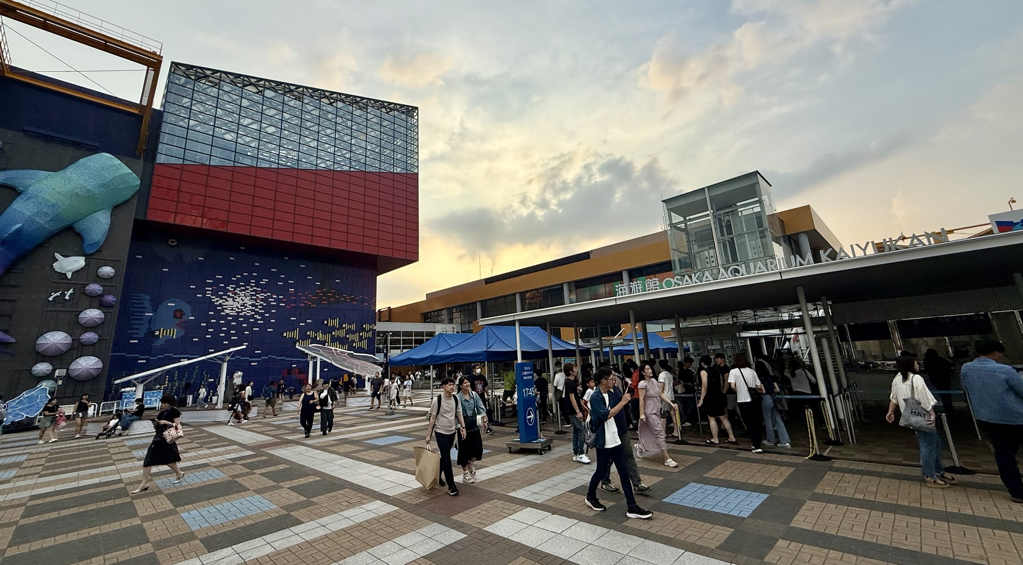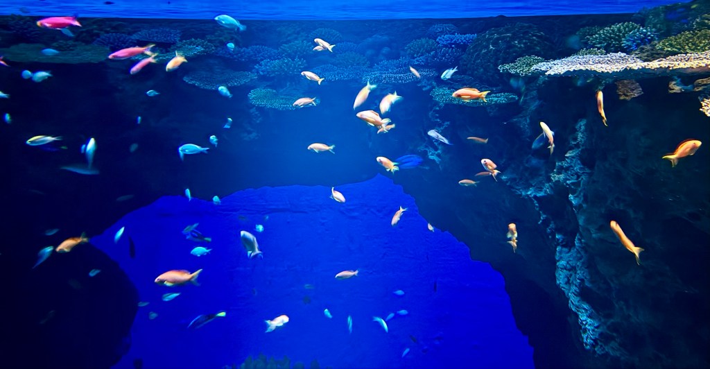 Around midday, Paresh and I chose to divide and conquer so that he could get some rest and recuperation. I ventured off for one last attraction in Osaka before we move on to our next destination. Kaiyukan, or the Osaka Aquarium, is one of the largest aquariums in the world with a unique construction quirk that routes guests through multiple side exhibits while simultaneously keeping them tethered to views of the massive central tank that houses several species of sharks, manta rays, large fish, and over 7.5 million liters of water. The aquarium has a multifaceted approach to spreading awareness about climate change and its effects on the ocean, encouraging guests to reflect on the ways in which we as a species can bend the curve away from our current doomsday trajectory.